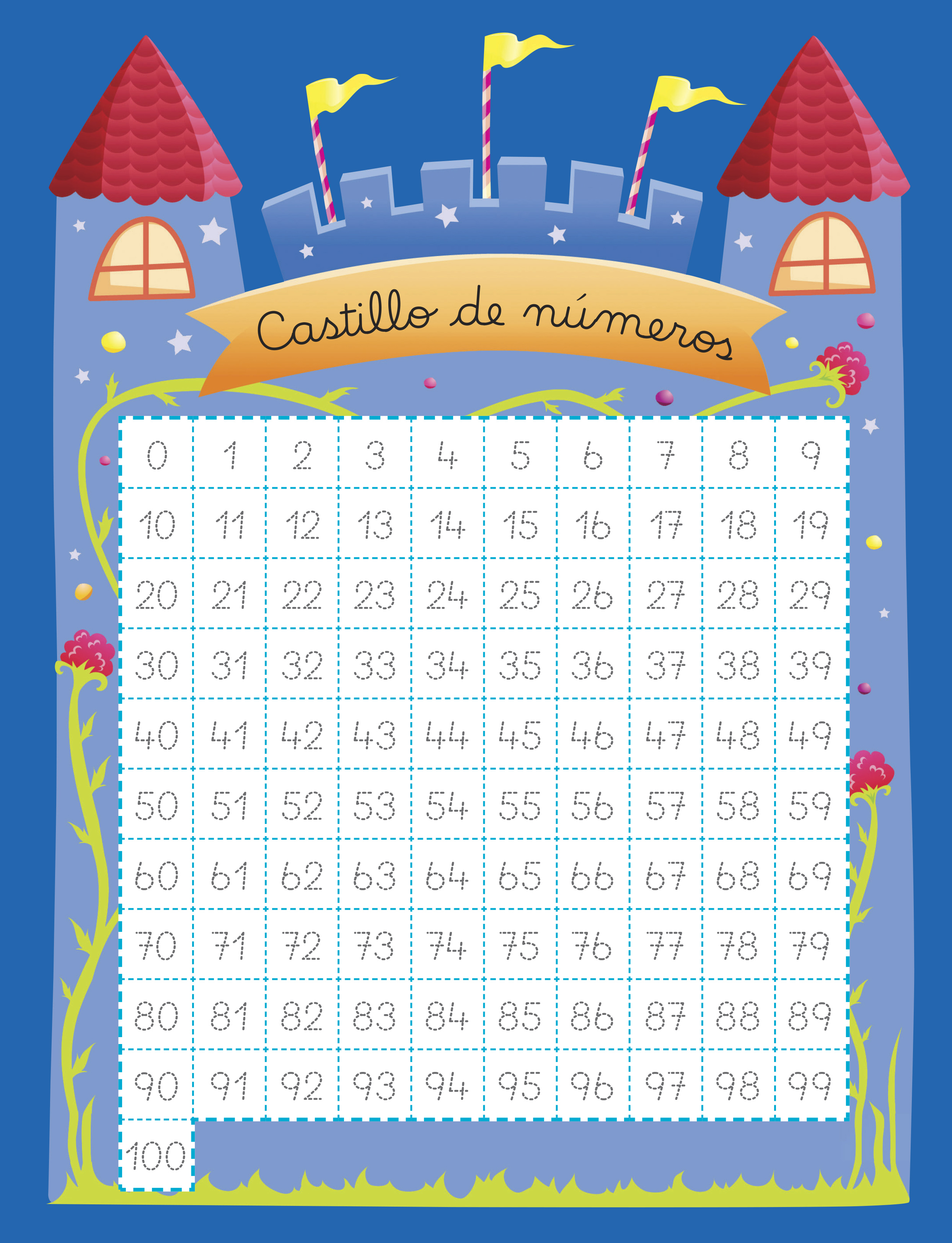 Presentación y práctica de la serie numérica del 1 al 100. Sistematización para su correcto trazado, reconocimiento de orden, seriación y nombre en cursiva.